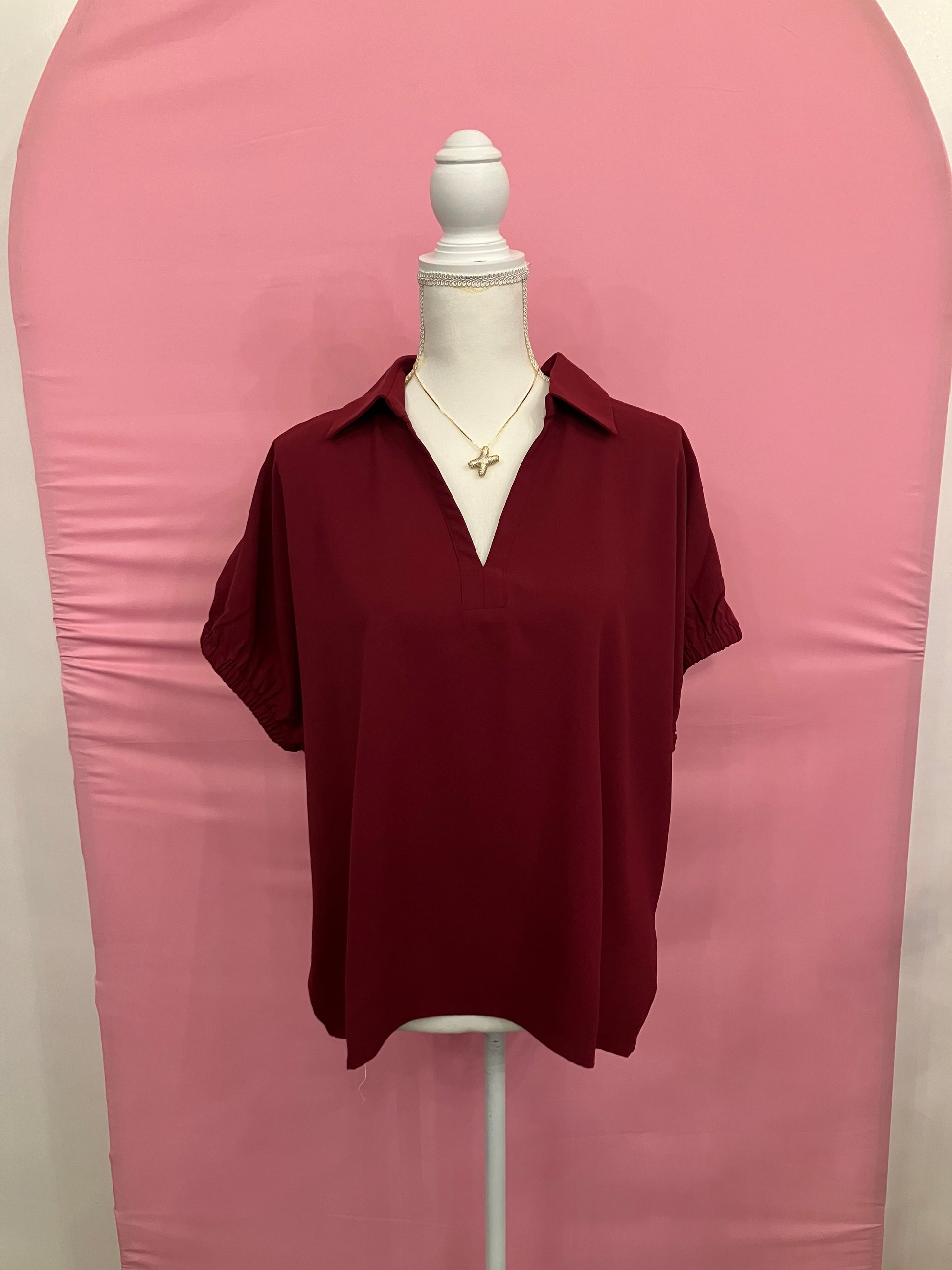 Solid short sleeve split collar side slit hem top. Unlined. Woven. Non-sheer. Lightweight.