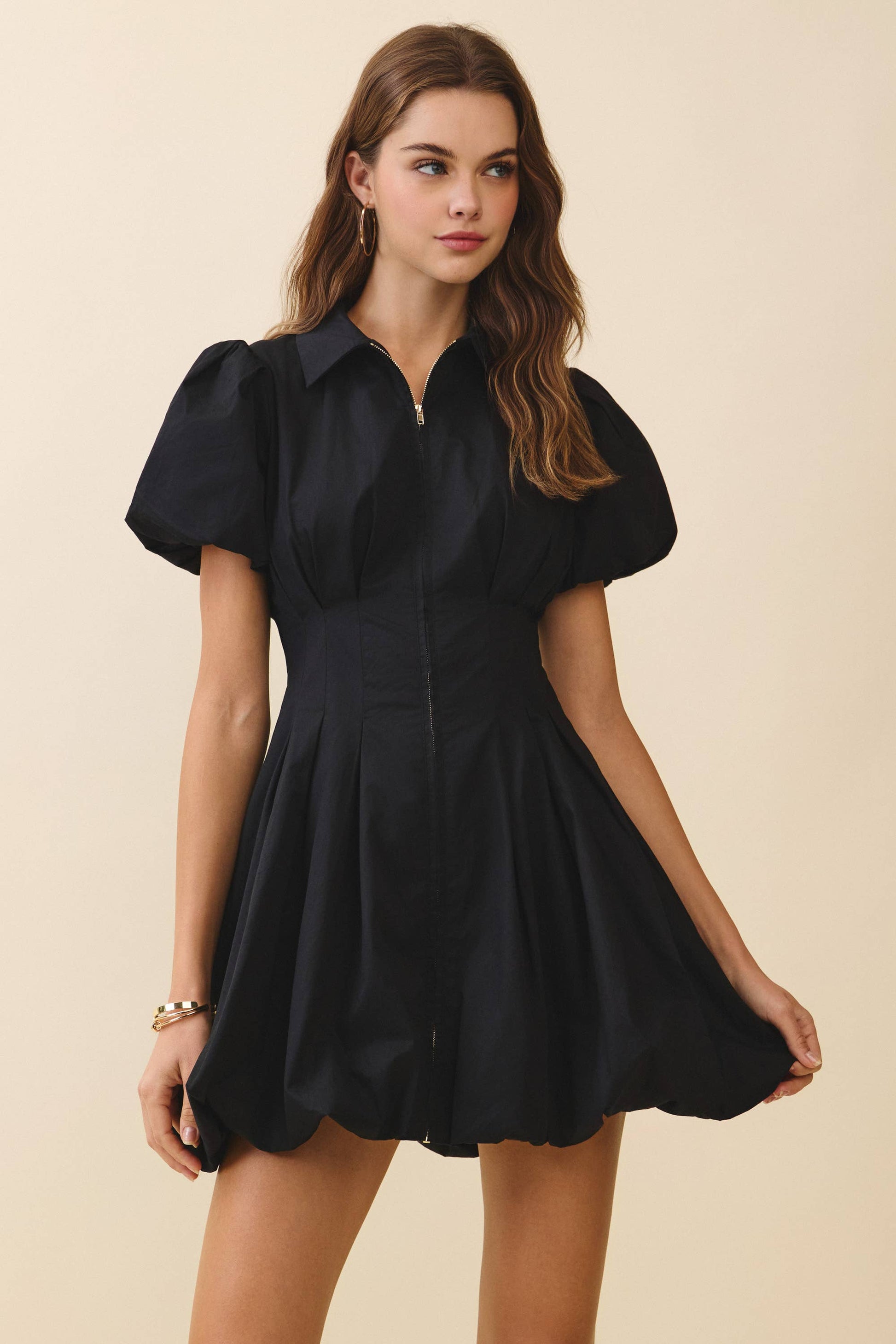 A fit-and-flare dress featuring a zippered front, collared neck, short bubble sleeves, and a matching bubble hem.