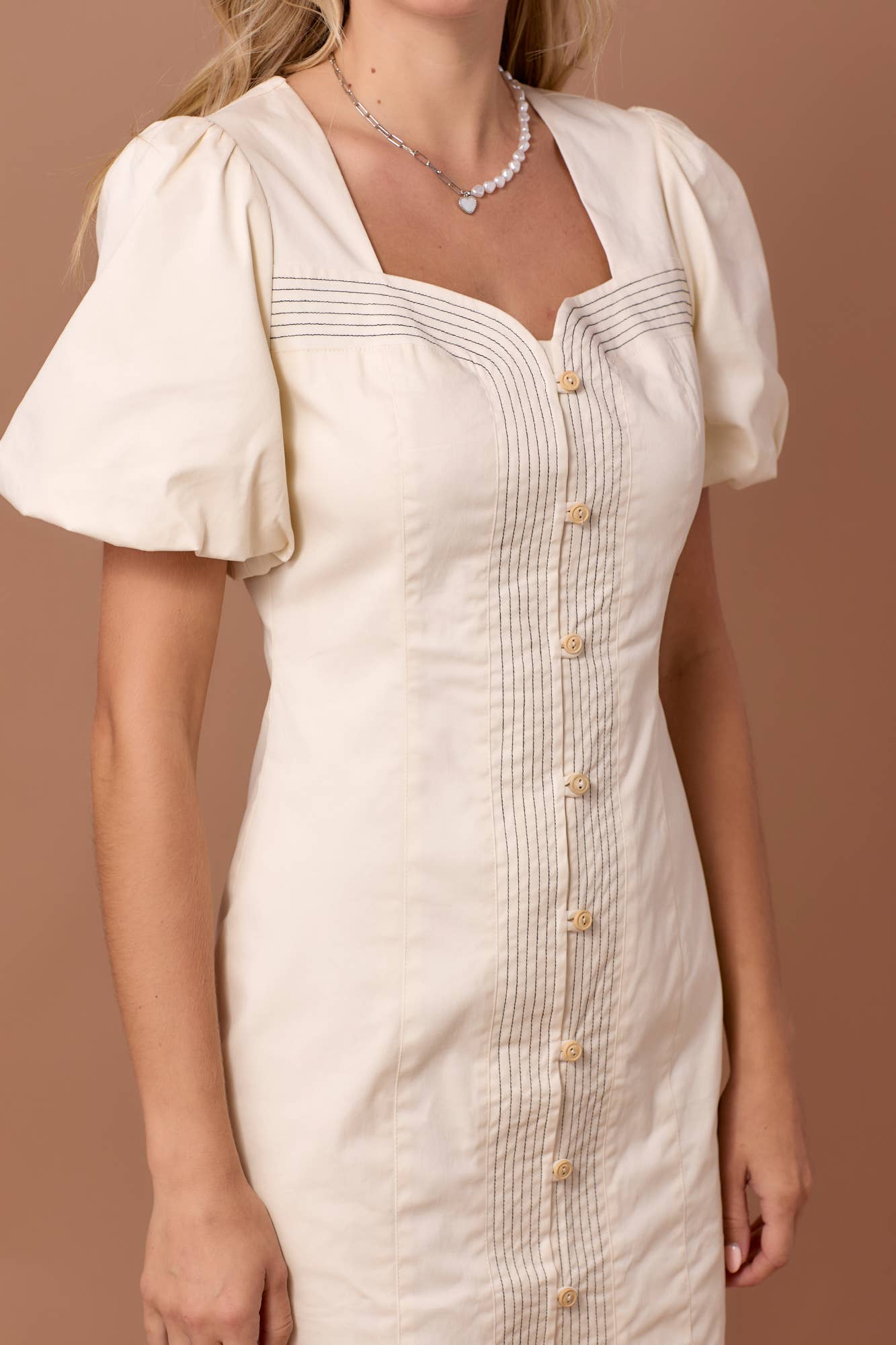 Easy fitted mini dress. Made from crisp cotton poplin. Defined by a voluminous puffed 'bubble' sleeve enhanced with contrast stitches. Wear to brunch or dates. It has a flattering neckline. Dress with a tote bag and sandals in the summer and wear with a pair of boots for transitional seasons.
