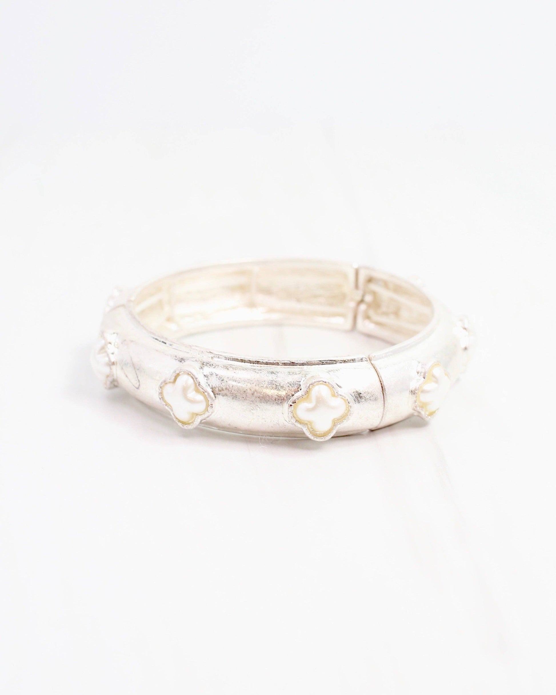 This beautiful bracelet wears like a bangle and stretches to fit most wrists. It is accented with pearl clover accents and has a worn silver finish. Stack multiple of this style together for a more statement stacked look.