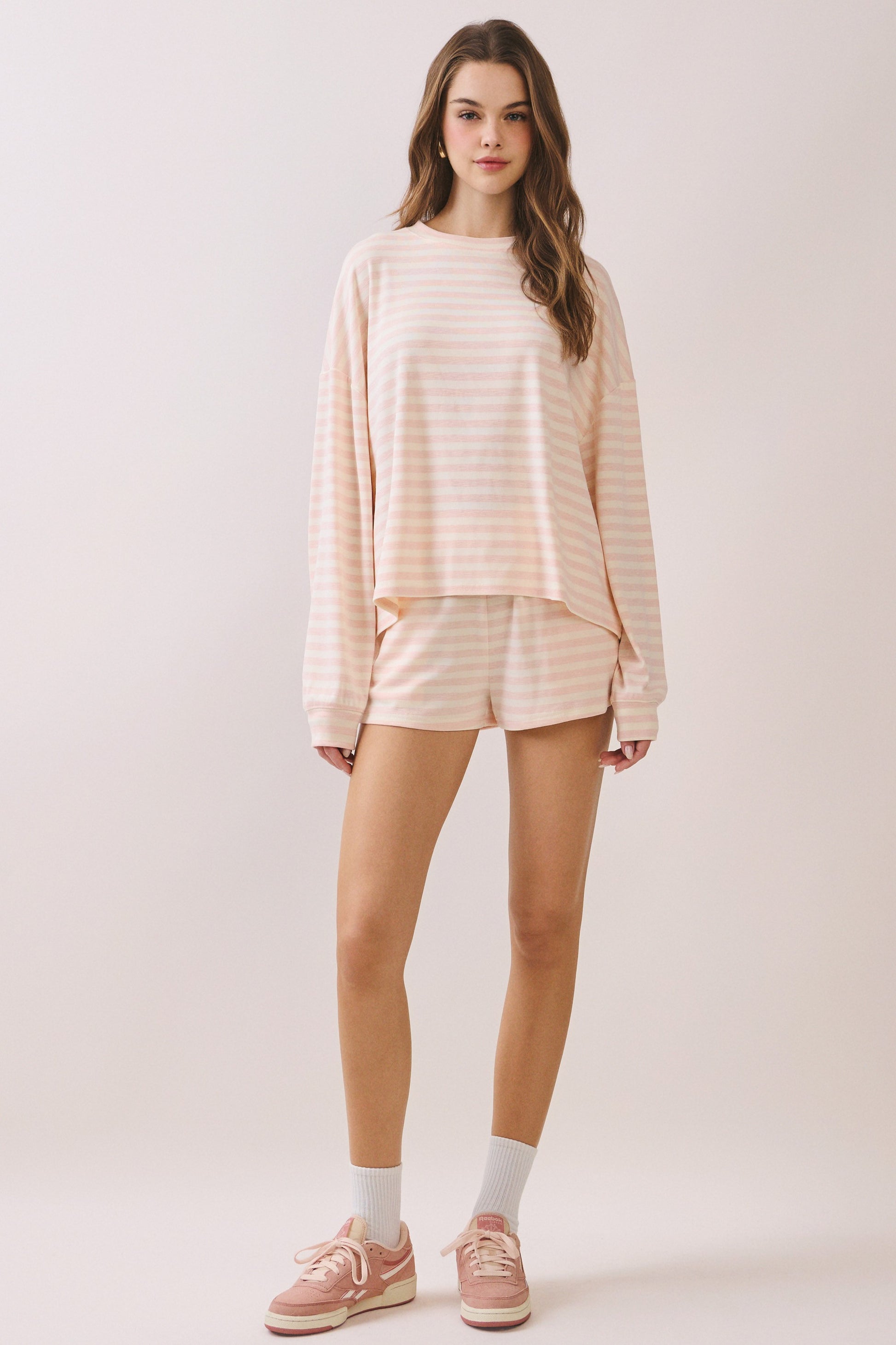 A soft striped lounge top featuring a relaxed oversized fit.