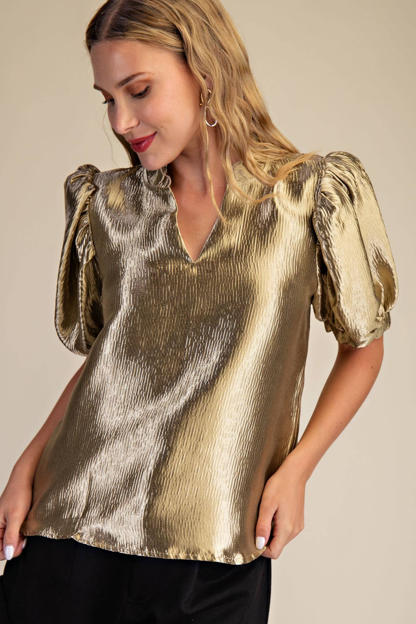 Ruffle V-Neck Puff Sleeve Top: Taupe / S
