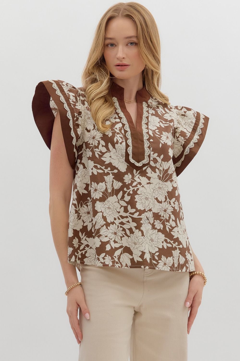 Floral print flutter sleeve top featuring contrast accent band with scallop lace trim inset. Unlined. Woven. Non-sheer. Lightweight.